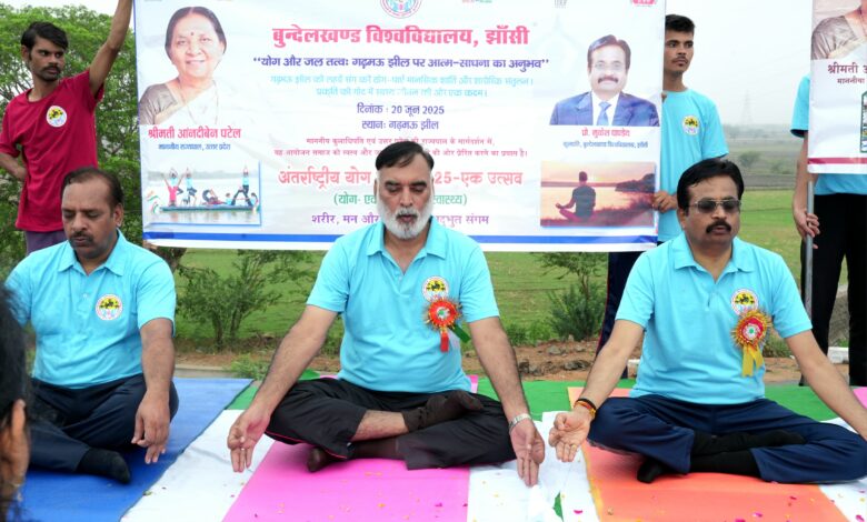 झांसी । बुंदेलखंड विश्वविद्यालय, झाँसी द्वारा एक प्रेरणास्पद आयोजन “योग और जल तत्त्व गढ़मऊ झील पर आत्म-साधना का अनुभव” शीर्षक से किया गया। यह आयोजन “30 दिन, 30 अनुभव” अभियान की श्रृंखला का एक विशेष भाग था, जिसके माध्यम से विश्वविद्यालय ने पूरे जून माह में योग, स्वास्थ्य और मानसिक संतुलन से संबंधित विविध गतिविधियाँ संचालित की हैं। इस कार्यक्रम का उद्देश्य था प्रकृति की गोद में योगाभ्यास द्वारा आत्मिक शांति, मानसिक स्थिरता और शारीरिक संतुलन की अनुभूति कराना तथा ‘एक धरती, एक स्वास्थ्य’ की भावना को जनमानस तक पहुँचाना। यह आयोजन कुलाधिपति एवं उत्तर प्रदेश की राज्यपाल आनंदी बेन पटेल के मार्गदर्शन एवं प्रेरणा से संपन्न हुआ। कार्यक्रम की अध्यक्षता कुलपति प्रो. मुकेश पाण्डेय ने की उन्होंने अपने उद्बोधन में कहा योग केवल शारीरिक व्यायाम नहीं, बल्कि यह जीवन के प्रति हमारी सोच को संतुलित करने का मार्ग है। गढ़मऊ झील जैसे प्राकृतिक एवं रमणीक परिवेश में योगाभ्यास आत्मिक शांति और मानसिक एकाग्रता को और अधिक सशक्त करता है। बुंदेलखंड विश्वविद्यालय का यह प्रयास स्वस्थ, जागरूक और संतुलित समाज की दिशा में एक महत्वपूर्ण कदम है। कुलसचिव राज बहादुर सिंह ने कहा गढ़मऊ झील पर आयोजित योग कार्यक्रम बुंदेलखंड विश्वविद्यालय की समाजोन्मुखी सोच का है। ऐसे आयोजन स्वास्थ्य, सामूहिक सहभागिता और प्रकृति के प्रति चेतना को बढ़ावा देते हैं। योग सत्र का संचालन भोपाल से आये प्रख्यात योग गुरुओं डॉक्टर रेखा गुप्ता एवं डॉक्टर नीलम मिश्रा द्वारा किया गया। डॉक्टर रेखा गुप्ता ने कहा प्राकृतिक वातावरण में किया गया योग शरीर और मन को भीतर से ऊर्जा प्रदान करता है। यह मन की चंचलता को नियंत्रित करने का सर्वोत्तम साधन है। डॉक्टर नीलम मिश्रा ने बताया नियमित योगाभ्यास से न केवल तन स्वस्थ रहता है, बल्कि यह जीवन में स्थिरता और आत्मिक अनुशासन भी लाता है। गढ़मऊ झील के शांत वातावरण में आयोजित इस कार्यक्रम में विद्यार्थियों, शिक्षकों, एनसीसी कैडेट्स और स्थानीय नागरिकों की उत्साहजनक सहभागिता रही। योगासनों में सूर्य नमस्कार, वृक्षासन, ताड़ासन, प्राणायाम, अनुलोम-विलोम आदि का अभ्यास किया गया। कार्यक्रम में आभार वक्ता डॉ. राजीव बबेले रहे, साथ ही डॉ. जितेन्द्र बबेले, डॉ. ऋषि सक्सेना, डॉ आर के सेनी, हितिका यादव,डॉ. धीरेंद्र यादव, श्री हेमंत चंद्रा, डॉ उपेंदर तोमर, डॉ रूपम सक्सेना, चंद्रभान प्रजापति, शशांक,आशीष वर्मा, डॉ के ले, सोनकर, अंजुल यादव, सहित विश्वविद्यालय के अनेक गणमान्य शिक्षकगण एवं कर्मचारीगण उपस्थित रहे। कार्यक्रम का समापन सामूहिक ध्यान एवं प्रसन्नता की अनुभूति के साथ हुआ, जिसने योग, प्रकृति और समाज के त्रिक सं