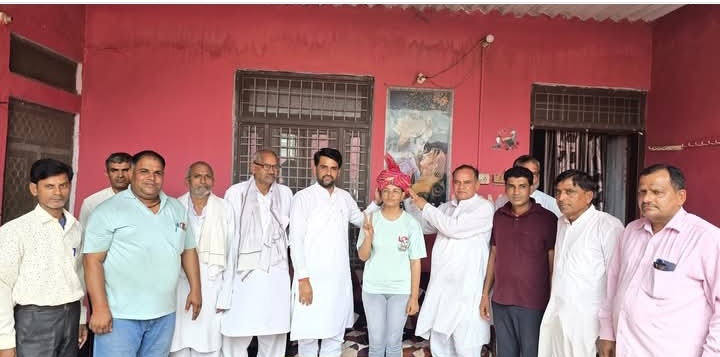 खैरथल : मुण्डावर विधायक एवं अलवर लोकसभा प्रत्याशी रहे ललित यादव ने किशनगढ़ विधानसभा के कोटकासिम निवासी अनुष्का सैन पुत्री श्री प्रवीण कुमार के घर पहुंचकर कक्षा सैकेण्डरी बोर्ड परीक्षा में 98.17% अंक प्राप्त करने पर छात्रा अनुष्का सैन का साफा पहनाकर सम्मान किया और उनके उज्जवल भविष्य की शुभकामनाएं दी.इस मौके पर पूर्व प्रधान रोहितास चौधरी ,बालिका के परिवारजन एवं ग्रामीण मौजूद रहे।