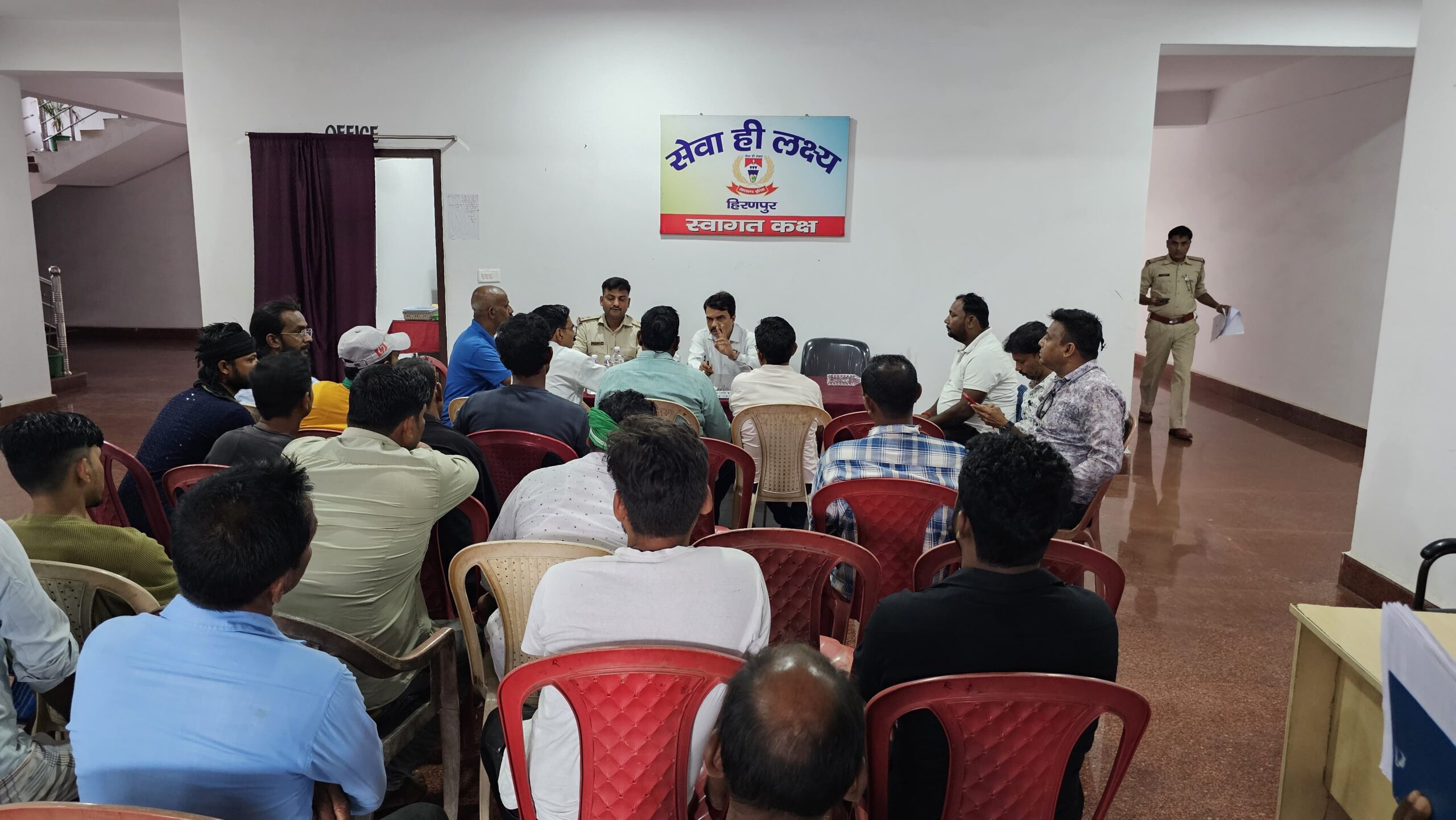 पाकुड़। पवित्र मुहर्रम अन्य के ध्यानार्थ विधि व्यवस्था संध्यानार्थ में सीओ मनोज कुमार की अध्यक्षता में हिरणपुर थाना सभागार में शान्ति समिति की आयोजित की गई। बैठक में उपस्थित थाना क्षेत्र के गणमान्य व्यक्ति व बुद्धिजीवियों ने त्यौहार को लेकर कई अहम सुझाव साझा किया। तत्पश्चात विधि व्यवस्था संध्यानार्थ में सुरक्षा व्यवस्था अन्य को लेकर विशेष चर्चाएं की गई। वही त्यौहार को लेकर थाना क्षेत्र में कड़ी सुरक्षा व्यवस्था करने, सोशल मीडिया पर पैनी नजर रखने व ग़लत अफवाहों से बचने की अपील की गई । अप्रयोजनीय गतिविधियों नजर आने पर सख्त कार्रवाई करने समेत आपसी भाईचारे के साथ मुहर्रम मनाने की अपील की गई। बैठक में थाना प्रभारी रंजन कुमार सिंह अन्य पुलिस पदाधिकारी व क्षेत्र के गणमान्य व्यक्ति उपस्थित थे।