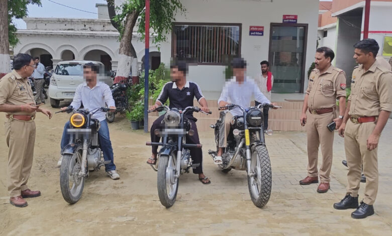 गजरौला शहर में बुलेट से पटाखे फोड़ रहे तीन युवा पुलिस ने पकड़ा सिखाया सबक बुलेटो को किया सीज
