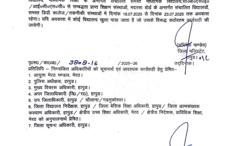 हापुड़ – कांवड़ यात्रा को लेकर 6 दिन के लिए सभी स्कूल-कॉलेजों में अवकाश घोषित ।