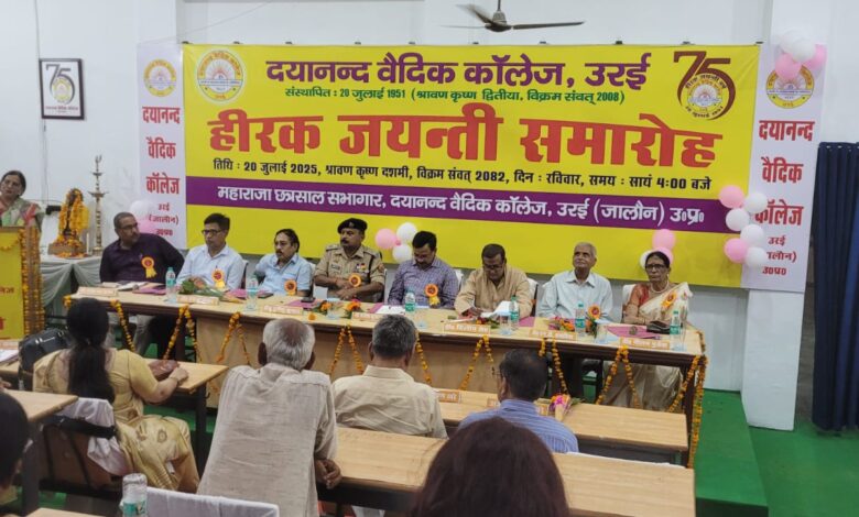 उरई : शहर के प्रतिष्ठित डीवी कॉलेज में शनिवार को स्थापना के 75 वर्ष पूर्ण होने के उपलक्ष्य में हीरक जयन्ती समारोह भव्यता और गरिमा के साथ मनाया गया। कार्यक्रम की शुरुआत मुख्य अतिथि जिलाधिकारी राजेश कुमार पाण्डेय, विशिष्ट अतिथि पुलिस अधीक्षक डॉ. दुर्गेश कुमार, समिति अध्यक्ष डॉ. एन.डी. समाधिया व प्राचार्य प्रो. राजेश चंद्र पांडेय सहित अन्य गणमान्य अतिथियों द्वारा मां सरस्वती की आराधना व दीप प्रज्वलन के साथ हुई।