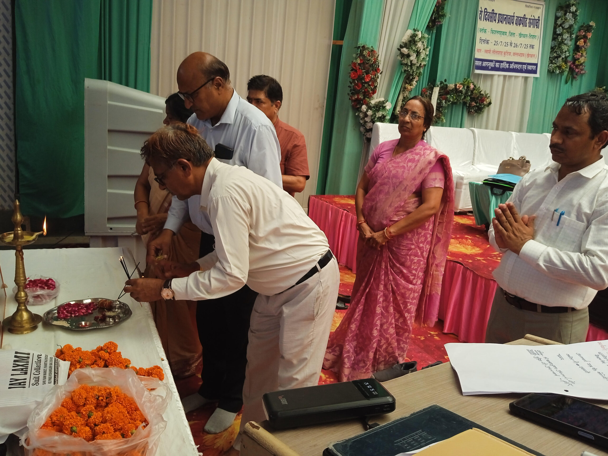 खैरथल : समीपवर्ती ग्राम बल्लभग्राम में स्वामी लीलाशाह की तपोस्थली कुटिया पर शुक्रवार को ब्लाक स्तरीय दो दिवसीय प्रधानाचार्य की वाकपीठ संगोष्ठी का आयोजन किया गया! कार्यक्रम में मुख्य अतिथि जिला शिक्षा अधिकारी प्रथम व प्रारम्भिक रामावतार शर्मा, ब्लाक शिक्षा अधिकारी शकुंतला मीणा,अतिरिक्त ब्लाक शिक्षा अधिकारी भारत भूषण शर्मा ने माँ सरस्वती की प्रतिमा के समक्ष दीप प्रजवलित कर संगोष्ठी का उद्घाटन किया संगोष्ठी में शनिवार को प्रभारी मंत्री किरोड़ी लाल मीणा के खैरथल आगमन पर उनके द्वारा हरियालो राजस्थान कार्यक्रम के तहत किये जाने वाले पौधरोपण में अपनी सक्रिय भूमिका दर्ज कराए जाने की चर्चा की गई!कार्यक्रम में जिला शिक्षा अधिकारी रामावतार शर्मा ने अपने उदबोधन में कहा की आप लोगो की किसी प्रकार भी समस्याओं को प्राथमिकता से निपटाया जायेगा उन्होंने सरकारी कार्यक्रमो को पूरी निष्ठा करने का आव्हान किया!कार्यक्रम में नामांकन अभिवृद्धि,फ्लेगशिप योजनाओं,पौधरोपण,पी एम श्री विद्यालय व अंग्रेजी माध्यमिक विद्यालय पर लम्बी चर्चा हुई