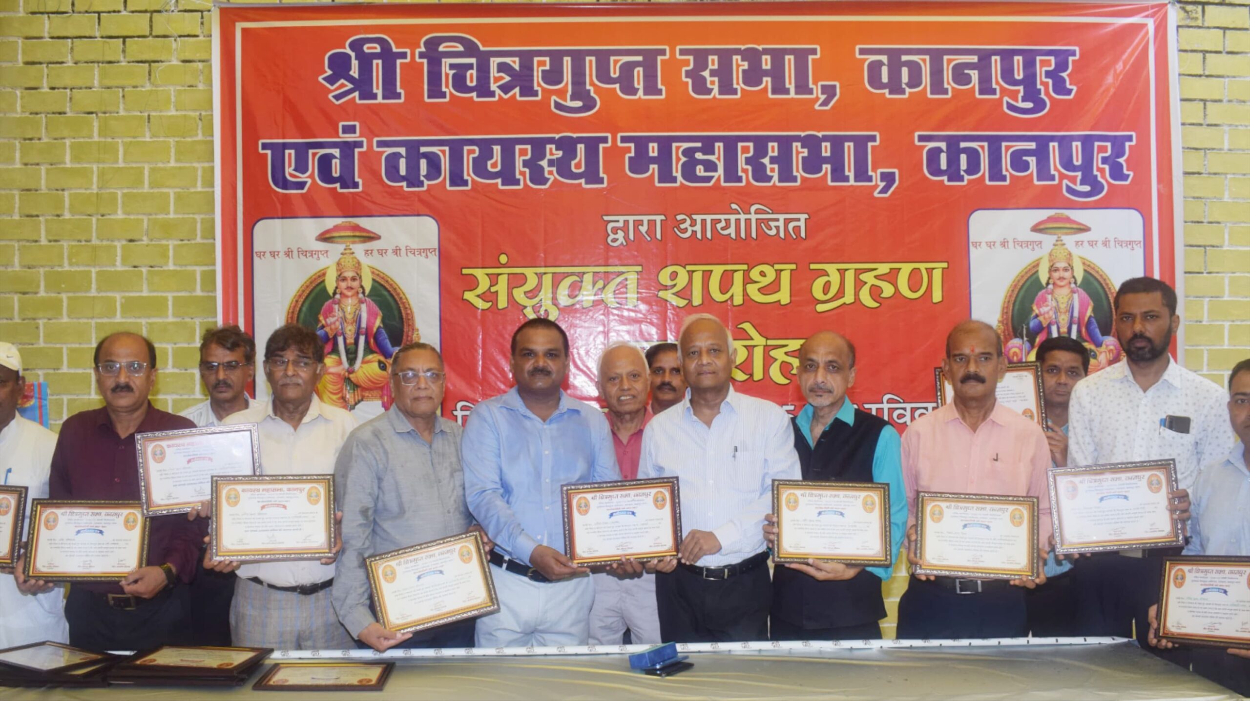 कानपुर : चित्रगुप्त सभा कानपुर व कायस्थ महासभा कानपुर का संयुक्त शपथ ग्रहण समारोह श्री निर्भयानंद पूर्णानंद चित्रगुप्त धर्मशाला रामबाग कानपुर में आयोजित किया गया चित्रांश प्रतीक निगम (एडवोकेट) के पुनः अध्यक्ष पद की शपथ ग्रहण ली तथा कायस्थ महासभा कानपुर के अध्यक्ष चित्रांश राहुल निगम मनोनीत हुए वही राष्ट्रीय कायस्थ महापरिषद के राष्ट्रीय अध्यक्ष चित्रांश ई. मयंक श्रीवास्तव व रवि कुमार निगम द्वारा नव मनोनीत पदाधिकारियों को संरक्षक मंडल के साथ शपथ दिलाई एवं गौतम निगम (एड०) व हरि मोहन निगम के चित्रगुप्त सभा व कायस्थ महासभा का महामंत्री नियुक्त किया गया। वही प्रमुख रूप से शपथ लेने वालों में कोषाध्यक्ष चित्रगुप्त सभा आशीष निगम व कायस्थ महासभा सतीश श्रीवास्तव उपाध्यक्ष रवि श्रीवास्तव,एड. आशीष निगम व अनूप कुमार श्रीवास्तव रहे वहीं कायस्थ सभा व चित्रगुप्त सभा के अध्यक्षों ने बताया कि दोनों संस्थाएं कायस्थ समाज के लिए अपनी-अपनी जिम्मेदारी का निर्वहन करेंगे। इस अवसर पर संस्था के संरक्षक महेंद्र निगम,पंकज निगम,शरद निगम,निखिलेश निगम,राकेश निगम,दिवाकर पंड्या,रजत निगम,नीरज कुमार श्रीवास्तव,विवके रंजन निगम,रविन्द्र श्रीवास्तव,संजय निगम सहित आदि लोग मौजूद रहे।