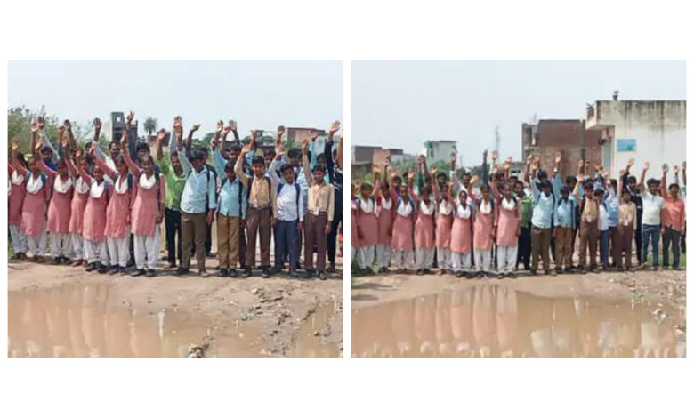 स्कूली बच्चों और ग्रामीणों ने किया प्रदर्शन, सड़क की जल्द मरम्मत की मांग