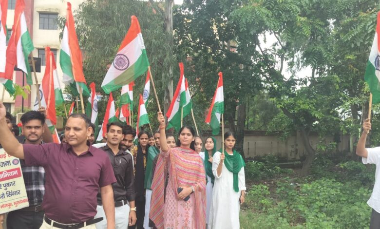 मुरादाबाद। भोजपुर मंगलवार को राजकीय महाविद्यालय भोजपुर में हर घर तिरंगा अभियान के अंतर्गत विविध राष्ट्रभक्ति गतिविधियों का भव्य आयोजन किया गया। कार्यक्रमों में प्रभात फेरी, तिरंगा यात्रा, तिरंगा संग सेल्फी, नारा लेखन तथा कविता पाठ आदि शामिल रहे। जिनमें छात्र-छात्राओं ने उत्साहपूर्वक भाग लिया। जिसके अंतर्गत नुक्कड़ नाटक, संवाद पत्र, जागरूकता रैली, पोस्टर प्रदर्शनी आदि प्रभावशाली गतिविधियाँ संपन्न हुईं। इन गतिविधियों के माध्यम से छात्र-छात्राओं एवं स्थानीय समुदाय को एचआईवी,एड्स के प्रति जागरूक किया गया। एड्स जागरूकता अभियान के संयोजक डॉ. अमित कुमार रहे, जबकि हर घर तिरंगा कार्यक्रम की संयोजक डॉ. पूजा नरमानी रहीं। समस्त कार्यक्रमों का निर्देशन एवं अध्यक्षता महाविद्यालय के प्राचार्य डॉ. नरेश कुमार द्वारा की गई। यह आयोजन न केवल देशभक्ति की भावना को सुदृढ़ करने वाला रहा, बल्कि सामाजिक चेतना को भी जाग्रत करने वाला सिद्ध हुआ। महाविद्यालय के प्राध्यापक गण कर्मचारी गण एवं छात्र-छात्राओं ने कार्यक्रम को सफल बनाने में अपना महत्वपूर्ण योगदान प्रदान किया।