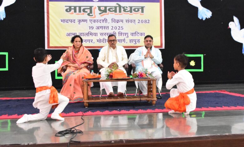 हापुड़। श्रीमती ब्रह्मादेवी सरस्वती बालिका विद्या मन्दिर में संचालित आभा डालमिया सरस्वती शिशु वाटिका में मातृ प्रबोधन कार्यक्रम का आयोजन किया गया। कार्यक्रम का शुभारम्भ मुख्य अतिथि डोमेश्वर साहू (संगठन मंत्री-विद्या भारती पश्चिमी उत्तर प्रदेश व उत्तराखण्ड) एवं विशिष्ठ अतिथि विशोक कुमार जी (शिक्षा समिति के प्रदेश निरीक्षक) द्वारा माँ सरस्वती के चरणों मे पुष्पाचीन व दीप प्रज्वलित करके किया गया। कार्यक्रम में शिशु मन्दिर के शिशुओं द्वारा स्वागत गीत व आभा डालमिया सरस्वती शिशु वाटिका के नन्हें मुन्हें शिशुओं ने भक्त ध्रुव पर आधारित सुंदर नाटिका की प्रस्तुति कर सबका मन मोह लिया। डोमेश्वर साहू ने “शिशुओं के सर्वांगीण विकास में माताओं का योगदान” विषय पर गहन चर्चा की। इस अवसर पर शिक्षा भारती की अध्यक्षा स्वाति गर्ग ने सभी माताओं का मार्गर्शन किया।