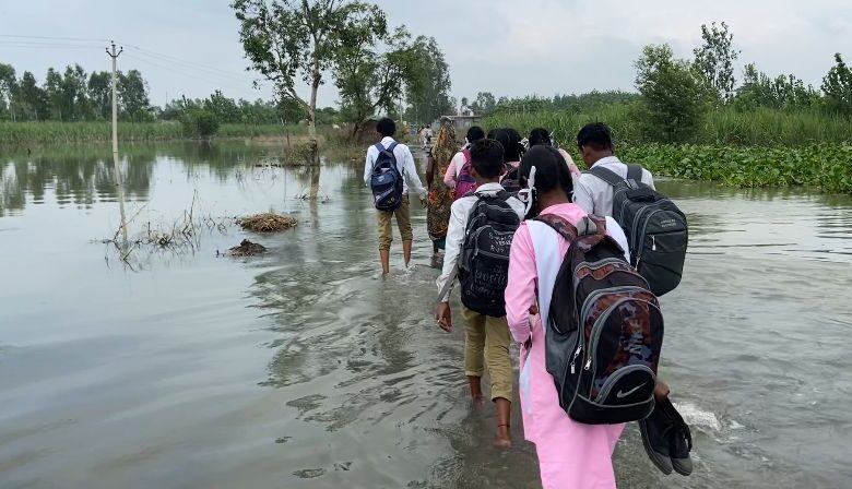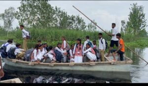 पानी में डूबी सड़क पर नाव में सवार होकर स्कूल जाने को मजबूर बच्चे ...