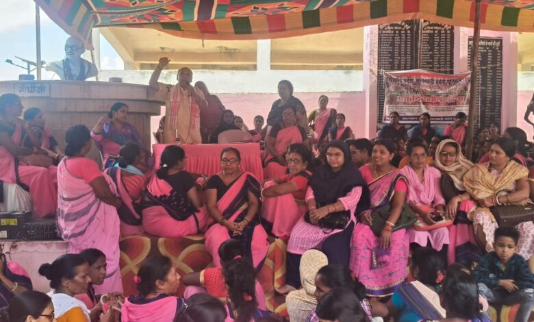 आंगनबाड़ी सेविकाओं का अशोक स्तंभ परिसर में धरना