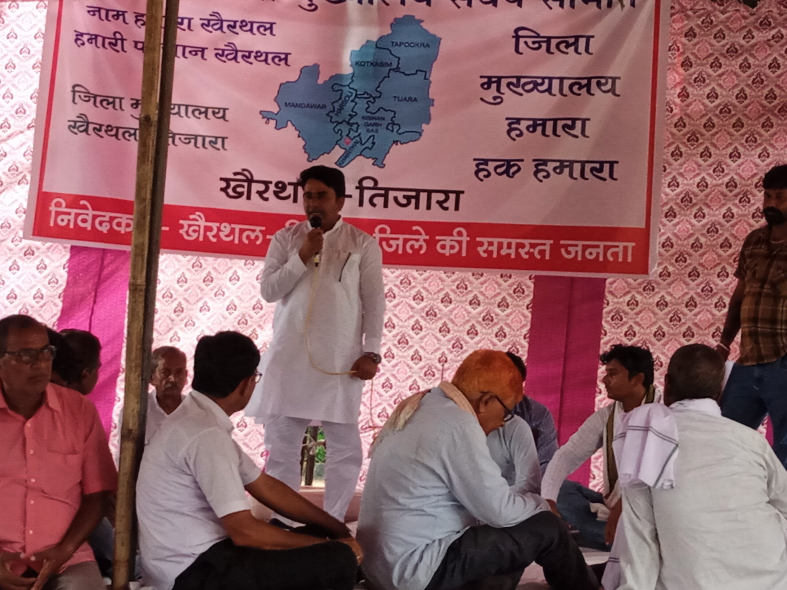 खैरथल : खैरथल में जिला बचाओ संघर्ष समिति के आह्वान पर चल रहा धरना-प्रदर्शन सातवें दिन भी जारी रहा।जिला बचाओ आंदोलन का गुरूवार को इक्कीस वां दिन रहा शुक्रवार को एआईएमआईएम के पदाधिकारियों ने घरना स्थल पर पहुंच कर आंदोलन को अपना समर्थन दिया पदाधिकारी जावेद खां ने अपने सम्बोधन में कहा हमारी जब भी जरूरत होगी हम इस संघर्ष मे आगे नजर आएगें सत्ता दिल नही देखती तादाद् देखती है इसलिए संघर्ष मे जिले के हर वासिंदैं को अपनी उपस्थिति दर्ज करानी चाहिए एआईएमआईएम राजस्थान ने एडीएम खैरथल को मुख्यमंत्री भजनलाल शर्मा के नाम ज्ञापन देकर खैरथल-तिजारा जिले का नाम और मुख्यालय यथावत रखने की मांग की इस मौके पर पार्टी के प्रदेश महासचिव व जिला प्रभारी इमरान नवाब, जिला अध्यक्ष अयूब खान, जिला उपाध्यक्ष वसीम सिंघल,जावेद खान महासचिव सोहेल खान, सचिव हामिद खान, हनीफ खान,जावेद खान, मौसम खान, इरशाद खान, इरफान खान आदि धरने पर मौजूद रहे धरने को चौधरी चरणसिंह संस्थान के मांगे राम चौधरी,आर एल पी जिलाध्यक्ष विजेंद्र कुमार ने भी संबोधन दिया धरना स्थल पर गिरीश डाटा,सर्वेश गुप्ता, कृष्ण चौधरी, शिवचरण गुप्ता, वीर सिंह ढिल्लन,श्यामलाल शर्मा, कामरेड रामचंद्र, हिमांशु भारद्वाज, मांगेराम चौधरी,सुनील शर्मा, जसवंत चौधरी, रिंकू शर्मा, अंकित लाटा, पहलाद गुप्ता,गिरीश लोढ़ा,गफ्फा़र खान,आर एल पी जिलाध्यक्ष विजेंद्र कुमार सहित अन्य लोग मौजूद रहे