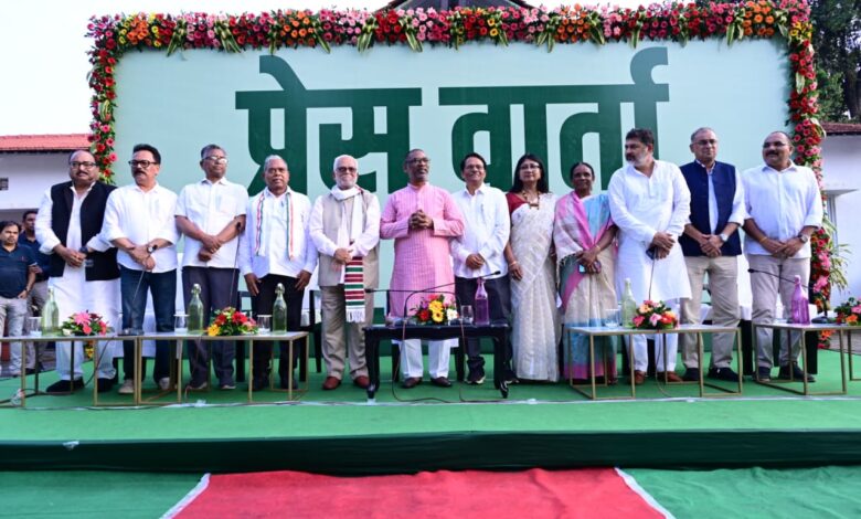 रांची। मुख्यमंत्री आवासीय कार्यालय परिसर में प्रेस / मीडिया के प्रतिनिधियों के साथ संवाद करते हुए मुख्यमंत्री हेमन्त सोरेन एवं उपराष्ट्रपति पद के चुनाव में इंडिया गठबंधन के प्रत्याशी बी. सुदर्शन रेड्डी। प्रेस वार्ता के मौके पर झारखंड कांग्रेस के प्रभारी के. राजू, अखिल भारतीय कांग्रेस कमेटी के राष्ट्रीय सचिव प्रणव झा, झारखंड प्रदेश कांग्रेस के अध्यक्ष केशव महतो कमलेश, लोक सभा सांसद रघुराम रेड्डी, जोबा मांझी, सुखदेव भगत एवं कालीचरण मुंडा तथा राज्यसभा सांसद महुआ माजी एवं सरफराज अहमद मौजूद थे।