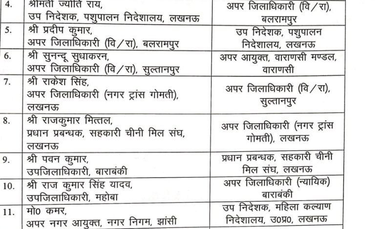 तबादले की विस्तृत सूची:1 राम प्रकाश को गोरखपुर औद्योगिक विकास प्राधिकरण (गीडा) का अपर मुख्य कार्यकारी अधिकारी (ACEO) नियुक्त किया गया है। 2 कुंवर पंकज को अपर जिलाधिकारी (वित्त-राजस्व), महोबा बनाया गया है। 3 नवीन चंद्र को अपर जिलाधिकारी (भूमि अधिग्रहण), मेरठ नियुक्त किया गया है। 4 ज्योति राय को अपर जिलाधिकारी (वित्त-राजस्व), बलरामपुर की जिम्मेदारी सौंपी गई है। 5 प्रदीप कुमार को उप निदेशक, पशुपालन निदेशालय, लखनऊ नियुक्त किया गया है।