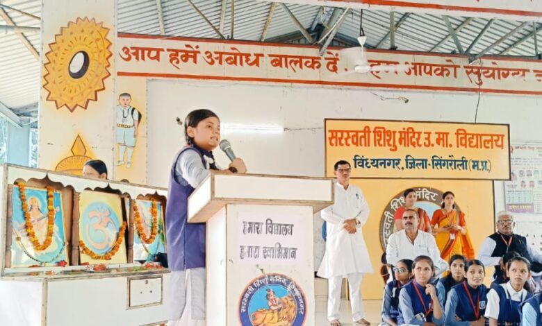 सिंगरौली । इस अवसर पर जिला शिक्षा अधिकारी के निर्देशानुसार प्रातः की प्रार्थना सभा में भैया/बहनों ने विद्यालयीन वातावरण को सुरम्य एवं सुसज्जित बनाने के लिए परिसर की स्वच्छता एवं विद्यालय प्रेरणा का केन्द्र बने आदि विषयों पर अपना विचार व्यक्त किया। विद्यालयके प्राचार्य मुद्रिका प्रसाद दुबे ने उपस्थित छात्रों के मध्य विद्यालीयन गौरव एवं सम्मान की विषय वस्तु छात्रों के समक्ष रखते हुये उन्हें स्वाभिमानी बनने की प्ररेणा दिए।