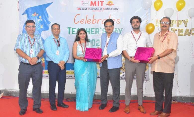 मेरठ। मेरठ इंस्टिट्यूट ऑफ टेक्नोलॉजी (एमआईटी) में शुक्रवार को शिक्षक दिवस धूमधाम से मनाया गया। इस अवसर पर शिक्षकों ने अपनी कला और प्रतिभा का प्रदर्शन कर सभी को मंत्रमुग्ध कर दिया। विभिन्न प्रतियोगिताओं में भाग लेकर फैकल्टी सदस्यों ने न केवल अपनी छिपी हुई प्रतिभा को उजागर किया, बल्कि शानदार प्रस्तुति देकर पुरस्कार भी जीते।कार्यक्रम में बतौर मुख्य अतिथि निदेशक डॉ. के. एल. ए. खान, प्रिंसिपल फार्मेसी डॉ. नीरज कांत शर्मा, प्रिंसिपल डॉ. हिमांशु शर्मा, डीन एकेडेमिक्स डॉ. गौरव शर्मा और सोनल अहलावत उपस्थित रहे। सभी गणमान्य अतिथियों ने शिक्षकों का उत्साहवर्धन किया और उन्हें राष्ट्र निर्माण में सबसे महत्वपूर्ण स्तंभ बताया।इस अवसर पर संस्थान के प्रबंधन ने कहा कि शिक्षक समाज की रीढ़ हैं और उनके बिना किसी भी राष्ट्र का विकास संभव नहीं है। मंच पर हुए रंगारंग कार्यक्रमों और फैकल्टी की शानदार प्रस्तुतियों ने समारोह को यादगार बना दिया। शिक्षक दिवस के इस भव्य आयोजन ने एमआईटी परिवार में नई ऊर्जा और उत्साह का संचार किया।
