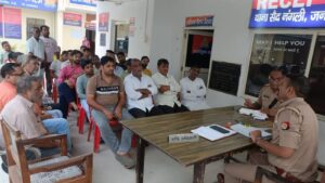 अमरोहा पुलिस अधीक्षक अमित कुमार आनंद के निर्देशन में क्षेत्राधिकारी दीप कुमार के पर्यवेक्षण में थानाध्यक्ष विकास कुमार सहरावत द्वारा थाना सैद नगली परिसर में आगामी त्यौहार दुर्गा पूजा, दशहरा , महाराजा अग्रसैन जयंती एवं वाल्मिकी जयंती को ध्यान में रखते हुए पीस कमेटी की बैठक आयोजित की गई l बैठक में क्षेत्र के संभ्रांनत नागरिकों , समाजसेवियो एंव जनप्रतिनिधियों ने भाग लिया l इस दौरान थानाध्यक्ष विकास कुमार सहरावत ने उपस्थित लोगों से आपसी सौहार्द, भाईचारा बनाए रखने तथा शांति एवं कानून व्यवस्था में सहयोग करने की अपील की गई l साथ ही त्योहारों के दौरान किसी भी प्रकार की अफवाह या भ्रामक जानकारी पर ध्यान न देने तथा किसी भी समस्या की स्थिति में तत्काल पुलिस को सूचित करने का अनुरोध किया गया l