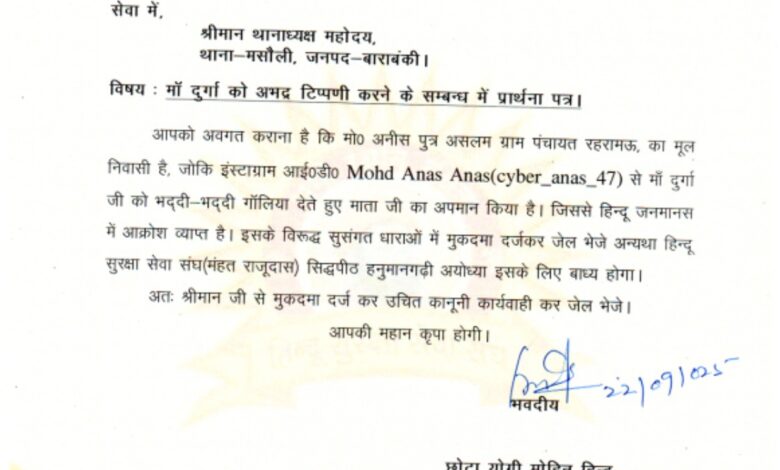 बाराबंकी जनपद के ग्राम पंचायत रहरामऊ के मोहम्मद अनीश पुत्र असलम का है जिसने अपनी इंस्टाग्राम आईडी के माध्यम से मां दुर्गा को गंदी गंदी गलियां व हिंदू की मां बहन की गली सहित अपमानजनक शब्दों की टिप्पणी करने वाले को थाना मसौली पुलिस ने धर दबोचा जिसको लेकर हिंदू जनमानस में आक्रोश ज्वाला दहक उठी है इन्हीं सारे मामलों को लेकर हिंदू सुरक्षा सेवा संघ के जिला प्रभारी मोहित हिंदू को लगी उन्होंने तुरंत अपने संघ के लोगो को लेकर जांच पड़ताल शुरू की और पता लगाने के बाद ने थाना प्रभारी मसौली को प्रार्थना पत्र के माध्यम से उचित कार्यवाही की मांग की है इस मौके पर जितेंद्र वर्मा जसवंत यादव मन्नू रावत पवन विश्वकर्मा सही तमाम सुरक्षा सेवा संघ मौजूद रहे