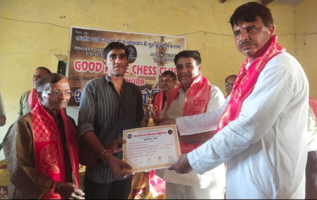 मथुरा। शतरंज उत्थान ट्रस्ट के तत्वाधान में गुडमुव चेस् क्लब द्वारा आयोजित द्वितीय शतरंज प्रतियोगिता का आयोजन सुभाष इंटर कॉलेज जनरलगंज में हुआ। मुख्य अतिथि के रूप में पंडित कृष्ण कुमार शर्मा उर्फ़ मुन्ना भैया संरक्षक सुभाष इंटर कॉलेज प्रमुख रहे और श्री मदन मोहन श्रीवास्तव अध्यक्ष होली दरवाजा व्यवसाय समिति कार्यक्रम की अध्यक्षता में रहे। प्रधानाचार्य सुभाष इंटर कॉलेज डॉक्टर मनवीर सिंह उपस्थित थे प्रतियोगिता में निर्णायक के रूप में विशाल सोनी श्री इंदु भूषण सैनी जी मुख्य निर्णायक की भूमिका में रहे इस प्रतियोगिता में 60 बच्चों ने भाग लिया बच्चे जिले के विभिन्न विद्यालयों से यहां आए थे प्रयुक्त प्रतियोगिता का परिणाम कुछ इस प्रकार रहा ओपन कैटेगरी में फर्स्ट माधव महरे, शिवम चौधरी सेकंड और शिव गौतम तीसरे स्थान प्राप्त हुआ अंडर-19 में तनिष्क चतुर्वेदी द्वितीय स्थान पर स्पर्श रहे तृतीय स्थान पर अर्जुन अरोरा रहे। अंडर 15 में प्रथम दीपक सिंह रहे सेकंड दक्ष सिरोही रहे और तृतीय दिव्यांश शर्मा अंडर 11 में काव्य चतुर्वेदी फर्स्ट प्राइज सेकंड प्राइस विप्रशर्मा थर्ड सिद्धार्थ चतुर्वेदी गुड मूड चेस्ट क्लब के अध्यक्ष प्रदीप चतुर्वेदी एवं सचिव राजकुमार वर्मा ने सभी विजेता खिलाड़ियों को हार्दिक शुभकामनाएं दी एवं उनके उज्जवल भविष्य की कामनाएं की कार्यक्रम में मुख्य रूप से उपस्थित रहे राजेश चौहान सर शिवा कुमार सर शैलेंद्र सर अनूप चतुर्वेदी राहुल उपाध्याय नकुल चौधरी रवि प्रकाश जी विकास गौतम जी अमित यादव जी रामेश्वर चतुर्वेदी आदि उपस्थित थे। कार्यक्रम के अंत में अध्यक्ष प्रदीप चतुर्वेदी ने सभी महानुभावों का हार्दिक स्वागत एवं अभिनंदन किया कार्यक्रम के समापन होने की घोषणा की।