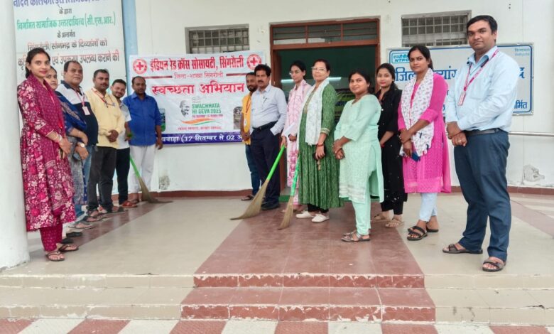 सिंगरौली । जिला मुख्यालय स्थित रेडक्रॉस सोसायटी कार्यालय स्वच्छता ही सेवा पखवाड़े के अंतर्गत इंडियन रेडक्रॉस सोसायटी सिंगरौली द्वारा जिला दिव्यांग पुनर्वास केंद्र (डीडीआरसी भवन) में स्वच्छता अभियान का आयोजन किया गया। इस अवसर पर भवन परिसर की साफ-सफाई कर स्वच्छ वातावरण बनाए रखने का संकल्प लिया गया।