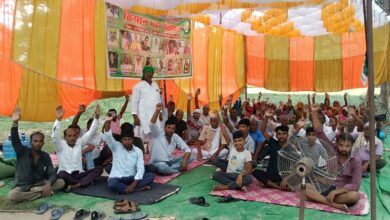 विकास कार्यों में लूट और अवैध कब्जे के विरोध में गंगौली में धरने पर बैठे भाकियू कार्यकर्ता