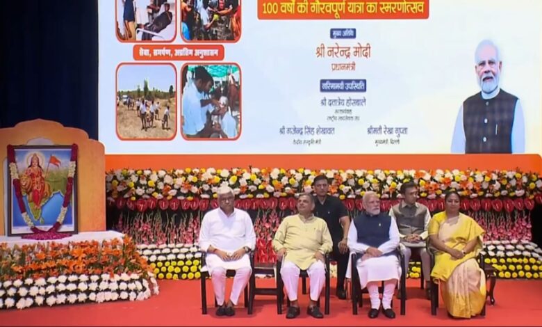 नई दिल्ली । प्रधानमंत्री नरेंद्र मोदी बुधवार को दिल्ली में राष्ट्रीय स्वयंसेवक संघ (आरएसएस) के शताब्दी समारोह में मुख्य अतिथि के रूप में शामिल हुए। इस कार्यक्रम में पीएम मोदी ने राष्ट्रीय स्वयंसेवक संघ (आरएसएस) के राष्ट्र के प्रति योगदान को रेखांकित करने वाला विशेष रूप से डिजाइन एक स्मारक डाक टिकट और सिक्के को जारी किया। इस साल विजयदशमी से लेकर 2026 विजयदशमी तक संघ शताब्दी वर्ष मनाएगा।