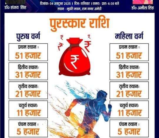 अमेठी। शनिवार को प्रदेश की पूर्व राज्यमंत्री डॉ. अमीता सिंह के जन्मदिवस पर नमो मैराथन प्रतियोगिता का आयोजन किया गया है।यह प्रतियोगिता सुबह 6.30 बजे भूपति भवन रामनगर से शुरू होगी और सराय खेमा, मुंशीगंज चौराहा, एचएएल गेट, शारदन, शुक्लन का पुरवा, डालव, धरईमाफी, जहूपुर, मुसवापुर चौराहा, थौरा, बेनीपुर, परसावां, छोटा रामनाथपुर, बाईपास, प्रतापगढ़ बाईपास, साईं धाम होटल, एसडीएम कॉलोनी व अंतू रोड होते हुए 21 किलोमीटर की दौड़ संपन्न कर आरआरपीजी कॉलेज अमेठी में समाप्त होगी।