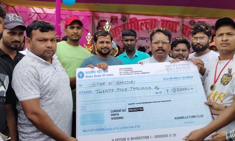 बोआरीजोर : गांधी जयंती के अवसर पर KYC कुशबिल्ला के सौजन्य से आयोजित नाइट क्रिकेट टूर्नामेंट में बांसजोरी की टीम ने शानदार प्रदर्शन करते हुए विजेता का खिताब अपने नाम किया। इस प्रतियोगिता का उद्देश्य ग्रामीण क्षेत्र में खेल भावना और आपसी सौहार्द को बढ़ावा देना रहा।कार्यक्रम के मुख्य अतिथि झामुमो केंद्रीय समिति सदस्य सिमोन मालतो रहे। हालांकि, ग्रामीणों में झामुमो क्षेत्रीय अध्यक्ष ताला बाबू हांसदा के आने की उम्मीद थी, लेकिन वे किसी कारणवश कार्यक्रम में शामिल नहीं हो सके।इस अवसर पर झामुमो क्षेत्रीय सचिव सिकंदर अंसारी, पंचायत मुखिया महेंद्र किस्कू, पूर्व मुखिया प्रतिनिधि सिकंदर अंसारी, पंचायत समिति सदस्य कुर्बान अंसारी, खेल अध्यक्ष मुख्तार अंसारी, सचिव मोहसिन अंसारी (डब्लू) तथा झामुमो पंचायत सचिव मो. सलाम सहित कई स्थानीय जनप्रतिनिधि एवं कार्यकर्ता मौजूद रहे।साथ ही, वार्ड सदस्य क़ासिम अंसारी, मुरताज अंसारी, अनवर अंसारी, अख्तर अंसारी, झामुमो नेता अब्दुल अंसारी, हुसैन अंसारी और श्यामसुंदर मालतो की भी गरिमामयी उपस्थिति रही।फाइनल मुकाबले में बांसजोरी टीम के कप्तान तबरेज अंसारी की अगुवाई में टीम ने शानदार जीत दर्ज की, जबकि बरद्वान की टीम उपविजेता रही।मैच के दौरान कमेंट्री की जिम्मेदारी अनुज सोरेन और ओमप्रकाश पंडित ने निभाई, जिनकी ऊर्जावान आवाज़ ने पूरे माहौल को रोमांचक बना दिया। आयोजन के दौरान भारी भीड़ उमड़ी, जिससे यह साफ झलकता है कि ग्रामीण इलाकों में खेलों के प्रति लोगों में गहरा उत्साह है।सफल आयोजन के लिए आयोजकों को क्षेत्रवासियों और खिलाड़ियों की ओर से भरपूर सराहना मिली।
