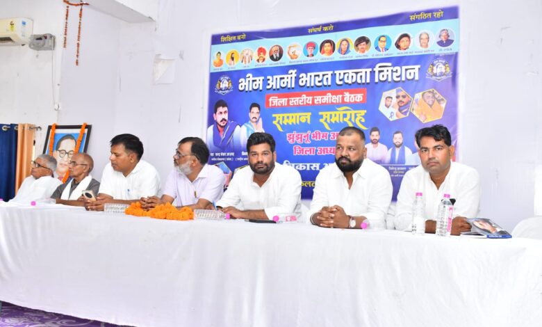 झुंझुनूं। कस्बे के अंबेडकर भवन में भीम आर्मी भारत एकता मिशन की विशाल जिला स्तरीय समीक्षा बैठक एवं सम्मान समारोह जिलाध्यक्ष विकास आल्हा की अध्यक्षता में आयोजित किया गया। कार्यक्रम का शुभारंभ संविधान निर्माता डॉ. भीमराव अंबेडकर की प्रतिमा पर दीप प्रज्वलित व माल्यार्पण कर किया। कार्यक्रम के मुख्य अतिथि अनिल धेनवाल राष्ट्रीय कोर कमेटी सदस्य एवं मध्य प्रदेश–महाराष्ट्र प्रभारी रहे। जबकि विशिष्ट अतिथि प्रदेशाध्यक्ष जितेंद्र हटवाल, प्रदेश महासचिव रघुवीर सिंह जोसवाल, प्रदेश सचिव डॉ. शकुन सिंह, समाजसेवी प्रदीप चंदेल, अजाक जिला अध्यक्ष डॉ. संपत बारूपाल, जिला संघर्ष समिति अध्यक्ष रामानंद आर्य, भीम प्रज्ञा संपादक हरीश पंवार तथा अतिरिक्त प्रशासनिक अधिकारी राजेश बजाड़ रहे।