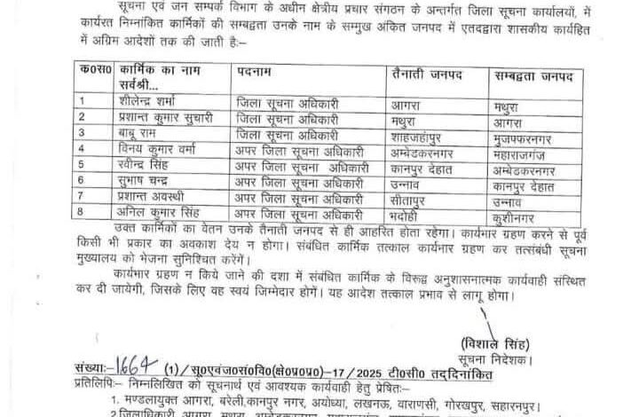 लखनऊ : उत्तर प्रदेश सरकार ने सूचना एवं जनसंपर्क विभाग में प्रशासनिक दक्षता बढ़ाने के लिए महत्वपूर्ण फेरबदल किया है। आधिकारिक आदेश संख्या-1664/सू०एवंजन०वि०-17/2025 टी०सी० के तहत कुल 8 सूचना अधिकारियों के तबादले किए गए हैं, जिनमें 3 जिला सूचना अधिकारी और 5 अपर जिला सूचना अधिकारी शामिल हैं। यह कदम सूचना का अधिकार (RTI) अधिनियम के तहत जिला स्तर पर सूचना सेवाओं को और सुदृढ़ करने के उद्देश्य से उठाया गया है।