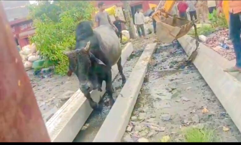 लोनी गाजियाबाद। लोनी रेलवे स्टेशन रोड पर आज एक अनोखा वाकया देखने को मिला, जब दो बेल आपस में भिड़ गए और लड़ते-लड़ते पास ही बने नाले में जा गिरे। मौके पर मौजूद स्थानीय लोगों ने तुरंत सूझबूझ दिखाते हुए पुलिस प्रशासन और गोसेवक अंशु पहलवान को इस घटना की सूचना दी। सूचना मिलते ही पुलिस टीम और गोसेवक दल मौके पर पहुंचा। स्थानीय निवासियों की मदद से JCB मशीन की सहायता से दोनों बेलों को सुरक्षित नाले से बाहर निकाला गया। राहत की बात यह रही कि किसी भी बैल को गंभीर चोट नहीं आई। स्थानीय लोगों ने बताया कि यदि समय पर मदद नहीं मिलती तो एक बड़ा हादसा घटित हो सकता था।
