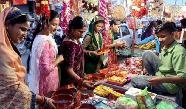 मथुरा। करवाचौथ पर बाजार की रौनक देखते ही बन रही है। शहर के बाजार सुहागिनों की चूड़ियों, आकर्षक साड़ियां, बिंदी, झुमके, आर्टिफिशियल ज्वैलरी, मेहंदी और श्रृंगार सामग्री से सज उठे हैं। करवाचौथ पर खरीदारी के लिए पिछले दो दिनों से महिलाओं की भीड़ दुकानों पर उमड़ रही है। किसी दुकान पर झुमके की चमक नजर आई तो कहीं पर चूड़ियों की खनक ने माहौल को खुशनुमा बना दिया। वहीं दुकानदार भी करवाचौथ को भुनाने में लगे हुए हैं। शुक्रवार को करवाचौथ का त्योहार है। पति की लंबी उम्र के लिए महिलाएं करवाचौथ का व्रत रखती हैं। इस कामना के साथ महिलाओं का सजने-संवरने का भी अवसर होता है। इसलिए हर कोई कुछ खास खरीदना चाहती है। बाजारों में पारंपरिक श्रृंगार सामग्री के साथ डिजाइनर साड़ियां, लेहंगे और सूट की भी खूब बिक्री हो रही है। इसके अलावा कलरफुल एवं डिजाइनर करवे बाजार की रौनक बढ़ा रहे हैं। जवाहर हाट गौरैया मठ मंदिर के पास करवा बेच रहे तरुण प्रजापत ने बताया कि उसके पास सजी सजाई आरती की थाली, लाल, गुलाबी, हरे कलर के करवा हैं। इसकी खूब बिक्री हो रही है। उसके पास 150 रुपये की सजी हुई थाली, 50 रुपये के डिजाइनर करवा हैं।