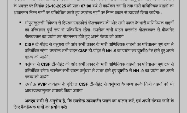 CISF टी-प्वाइंट से वसुंधरा मार्ग पर हल्के निजी वाहनों को भी आवश्यकता अनुसार डायवर्ट किया जाएगा