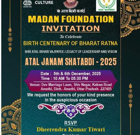 अमेठी। भारत रत्न अटल बिहारी वाजपेयी की जन्म शताब्दी वर्ष के उपलक्ष्य में मदन फाउंडेशन द्वारा 5 और 6 दिसंबर को दो दिवसीय भव्य कार्यक्रम आयोजित किया जाएगा। यह आयोजन संस्कृति मंत्रालय, भारत सरकार के सहयोग से अमेठी के एक मैरिज लॉन में सुबह 10 बजे से शाम 5:30 बजे तक चलेगा। कार्यक्रम में जिले के समाजसेवी, साहित्यकार, अधिवक्ता, पत्रकार और सम्मानित नागरिक बड़ी संख्या में शामिल होंगे। आयोजक ने बताया कि पहले दिन 5 दिसंबर को एक विराट कवि सम्मेलन आयोजित किया जाएगा। जिसका संचालन प्रख्यात कवि समीर मिश्र करेंगे। सम्मेलन में रवींद्र रंजन शिकोहाबादी, निर्झर प्रतापगढ़, डॉ. फूल कली ‘पूनम’, डॉ. अर्चना ओजस्वी, मकसूद जाफरी, चंद्रप्रकाश पांडेय ‘मंजुल’, रामेश्वर सिंह निराशा, राज किशोर सिंह, सुरेश शुक्ला, नवीन, रामबदन शुक्ल पथिक तथा आराध्या पांडेय ‘दिन प्रतापगढ़ी’ सहित कई सम्मानित कवि अपनी प्रभावपूर्ण प्रस्तुतियाँ देंगे।
