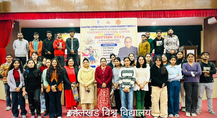 बरेली। महात्मा ज्योतिबा फुले रूहेलखण्ड विश्वविद्यालय बरेली के विश्वविद्यालय सांस्कृतिक केन्द्र द्वारा आज दिनांक 8 दिसंबर से 12 दिसंबर तक वार्षिक सांस्कृतिक  प्रतियोगिताओं की श्रृंखला रिदम 2025 का शुभारंभ किया गया।  कार्यक्रम का शुभारंभ दीप प्रज्वलन  एवं सरस्वती वंदना से हुआ।  आज दिनांक 8 दिसंबर को एकल गायन  तथा कार्टूनिंग  की प्रतियोगिताएं आयोजित की गई जिसमें बड़ी संख्या में विद्यार्थियों ने अत्यंत उत्साह के साथ भाग लिया और अपनी रचनात्मक  प्रतिभा का उत्कृष्ट प्रदर्शन किया। प्रतियोगिता में विद्यार्थियों ने शास्त्रीय संगीत से  लेकर लोक संगीत की विविध विधाओं में  अपनी  कला का प्रदर्शन कर दर्शकों को  मंत्र मुग्ध कर दिया। निर्णायक मंडल में डॉ.ज्योति पाण्डेय, डॉ.इंद्रप्रीत कौर, डॉ.रीना पंत और डॉ.सौरभ वर्मा रहे । निर्णायकों द्वारा प्रतियोगियों  की कलात्मक  और संगीतकमक क्षमताओं का  मूल्यांकन किया गया। कार्यक्रम का आयोजन माननीय   कुलपति प्रो. के.पी. सिंह जी के संरक्षण में हुआ।  रिदम 2025 के आगाज ने कैंपस में ऊर्जा, उत्साह, और सांस्कृतिक रंगों का सुंदर माहौल  बना दिया। कार्यक्रम के आयोजन में कुलसचिव श्री  हरीश  चंद,सांस्कृतिक समन्वयक डॉ.ज्योति पाण्डेय ,डॉ. इंद्रप्रीत कौर ,डॉ. सौरभ वर्मा ,डॉ.रीना पंत, डॉ.अतुल कटिहार, मीडिया सेल से डॉ.अमित कुमार सिंह, श्री तपन वर्मा तथा कल्चरल क्लब से पंखुड़ी कंचन , मेधावी वर्मा,  दीपांशी , तनिष्का, पीयूष पाल, महक , मुमताज़, कविता, शिवम् गंगवार ,शौर्य,अपूर्वा भव्या शर्मा   शिवम पटेल, आलमीन नक़वी,आन्या शुक्ला, कृशांगी, ऋषभ आदि का सहयोग रहा।