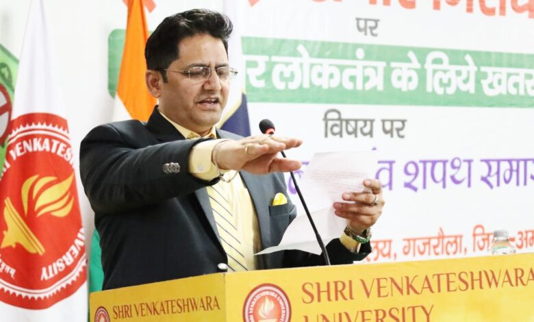 मेरठ। राष्ट्रीय राजमार्ग बाईपास स्थित श्री वेंकटेश्वरा विश्वविद्यालय/संस्थान में ‘‘अंतर्राष्ट्रीय भ्रष्टाचार निरोधक दिवस’’ के अवसर पर ‘‘भ्रष्टाचार: वैश्विक अभिशाप एवं लोकतंत्र के लिए खतरा’’ विषय पर एकदिवसीय राष्ट्रीय संगोष्ठी एवं भ्रष्टाचार विरोधी शपथ समारोह का भव्य आयोजन किया गया। कार्यक्रम में देशभर से आए वक्ताओं ने भ्रष्टाचार को राष्ट्र की प्रगति में सबसे बड़ा अवरोध बताते हुए इसकी कड़े शब्दों में निंदा की।