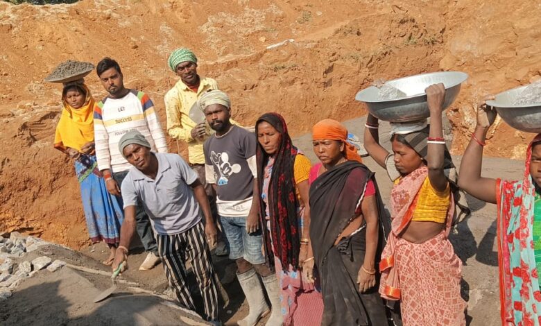 बाप करणी पकड़ कर पुलिया में पत्थर की जोड़ाई कर रहा है साथ में बेटा नीलकंठ गंझू सीमेंट मिलाकर बाप का हाथ बटा कर सहयोग कर रहा है।