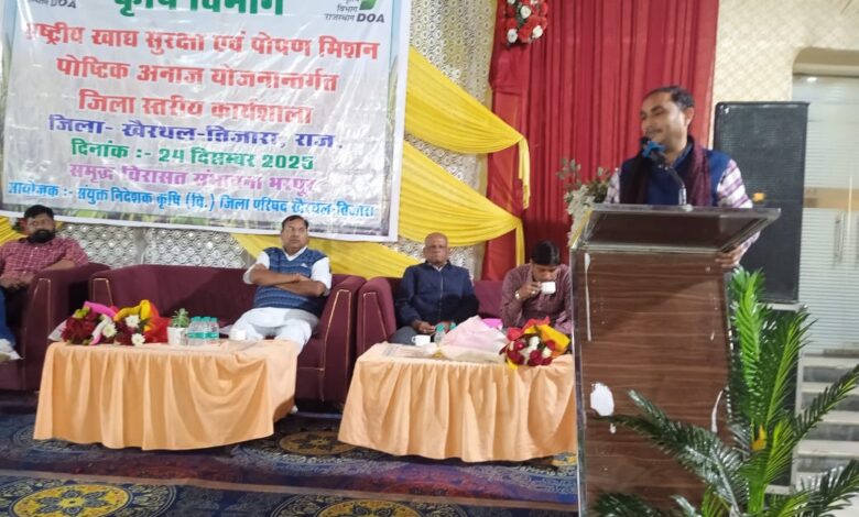 खैरथल : क़ृषि विभाग द्वारा राष्ट्रीय खाद्य सुरक्षा एवं पोषण मिशन (मोटा अनाज) विषय पर पूर्व विधायक रामहेत सिंह यादव के मुख्य आतिथ्य एवं भाजपा जिलाध्यक्ष महासिंह चौधरी की अध्यक्षता मे मोटे अनाज एवं राष्ट्रीय खाद्य सुरक्षा एवं पोषण मिशन विषय पर कार्यशाला का आयोजन मातौर रोड स्थित एक निजी होटल में किया गया !