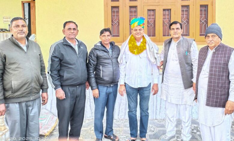 तेजाजी मन्दिर में 3 हजार क्विंटल बजरी देने की घोषणा करने पर सरपंच महेन्द्र थाकन का स्वागत किया