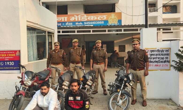 मेरठ। वरिष्ठ पुलिस अधीक्षक मेरठ के निर्देश पर चलाए जा रहे चेकिंग अभियान के तहत थाना मेडिकल पुलिस ने वाहन चोरी के मामलों में बड़ी सफलता हासिल की है। पुलिस ने काली नदी के पास जागृति बिहार एक्सटेंशन से दो शातिर वाहन चोरों को गिरफ्तार कर उनके कब्जे से चार अदद चोरी की मोटरसाइकिल बरामद की हैं।