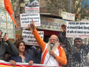 लोनी गाजियाबाद : मुख्य कंझावला रोड स्थित शनि मंदिर परिसर में यूनाइटेड हिंदू फ्रंट द्वारा आयोजित प्रदर्शन के दौरान कार्यकर्ताओं ने अभिनेता शाहरुख़ ख़ान के खिलाफ नारेबाज़ी करते हुए उनका पुतला जलाया। संगठन ने प्रधानमंत्री, गृह मंत्री, सूचना एवं प्रसारण मंत्री, वित्त मंत्री तथा नई दिल्ली स्थित बांग्लादेश हाई कमीशन को ज्ञापन सौंपकर आरोप लगाया कि बांग्लादेश में हिंदू समुदाय पर हो रही हिंसा के बीच शाहरुख़ ख़ान द्वारा बांग्लादेशी खिलाड़ी को 9.20 करोड़ रुपये में खरीदे जाने का निर्णय लोगों की भावनाओं को आहत करता है।