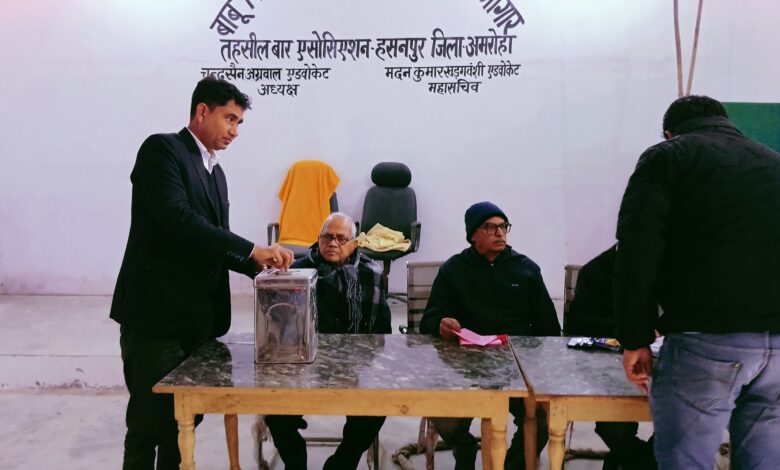 अमरोहा/ हसनपुर :  बार एसोसिएशन तहसील हसनपुर के वार्षिक चुनाव सोमवार को कड़ी सुरक्षा व्यवस्था के बीच शांतिपूर्ण ढंग से संपन्न हुए। देर शाम घोषित हुए परिणामों में गजेंद्र सिंह ने अध्यक्ष और बृज किशोर ने महासचिव पद पर जीत दर्ज की। परिणाम घोषित होते ही समर्थकों ने नवनिर्वाचित पदाधिकारियों का फूल-मालाओं से जोरदार स्वागत किया।मुख्य चुनाव अधिकारी की देखरेख में हुई मतगणना के अनुसार, अध्यक्ष पद पर गजेंद्र सिंह को 86 मत प्राप्त हुए, जबकि उनके निकटतम प्रतिद्वंद्वी चौधरी मुजाहिद हुसैन को 77 और राजेंद्र सिंह को मात्र 7 वोट मिले। गजेंद्र सिंह ने 9 मतों के अंतर से जीत हासिल की।​महासचिव पद पर बृज किशोर ने 92 मत हासिल कर फतेह सिंह को 78 मत प्राप्त हुए। बृज किशोर 14 वोटों से विजई। वहीं, कोषाध्यक्ष पद के त्रिकोणीय मुकाबले में हितेश त्यागी को 71, नंदराम सिंह को 59 और विक्रांत त्यागी को 40 मत मिले। हितेश त्यागी ने 12 मतों से विजय प्राप्त की।