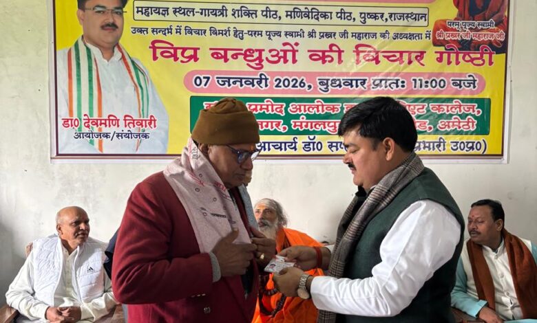 अमेठी। बुधवार को प्रमोद आलोक इंटर कालेज अमेठी में विप्र बंधुओं की विचार गोष्ठी का आयोजन हुआ |कार्यक्रम आयोजक डॉ॰देव मणि तिवारी के कुशल संयोजन में अंतराष्ट्रीय ख्यातिलब्ध सनातन संत पूज्य प्रखर जी महराज की अध्यक्षता में ब्राम्हण एवं सनातन संस्कृति पर व्यापक विचार विमर्श हुआ।