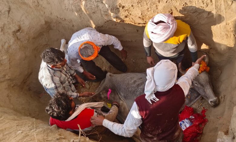 किसान महापंचायत खैरथल–तिजारा के जिलाध्यक्ष वीरेंद्र चौधरी ने बताया कि गांव निवासी अजीत चौधरी के यहां पाली गई बुजुर्ग गाय ने आज अंतिम सांस ली। इसके पश्चात परिवार सहित पूरे गांव ने गौ माता का अंतिम संस्कार सामूहिक रूप से और सम्मानपूर्वक करने का निर्णय लिया।