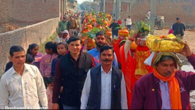 परौता में कलश यात्रा संपन्न श्रीमद्भागवत कथा का पाठ शुरू पुलिस प्रशासन मौजूद