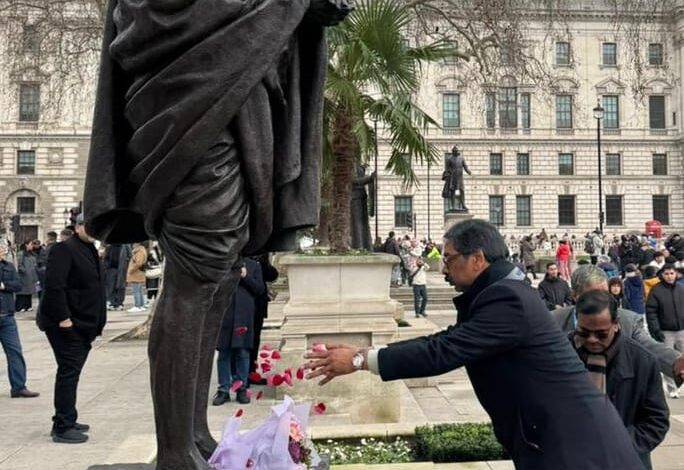 The Chief Minister paid floral tributes to the Father of the Nation, Mahatma Gandhi, at his statue in Parliament Square, London.
