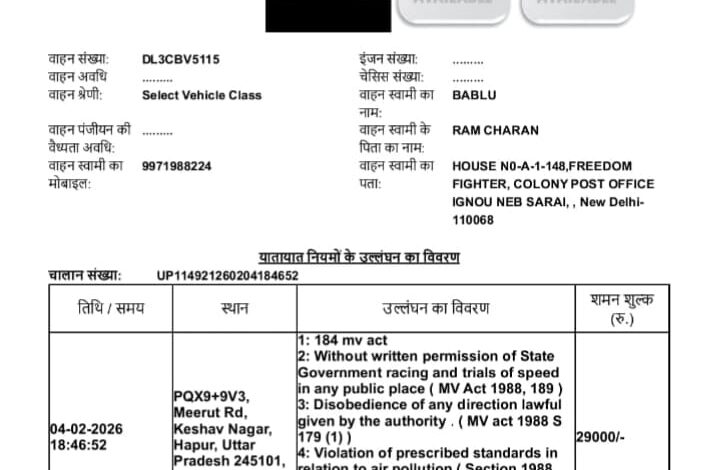 हापुड (यूपी)- चलती कार पर जानलेवा स्टंट करने वाले युवकों पर यातायात पुलिस ने की कार्यवाही । कार की छत पर खड़े होकर और स्टेयरिंग छोड़कर स्टंट का वीडियो हुआ था वायरल । ट्रैफिक पुलिस ने नियम उल्लंघन पर 29 हजार रुपये का चालान किया।