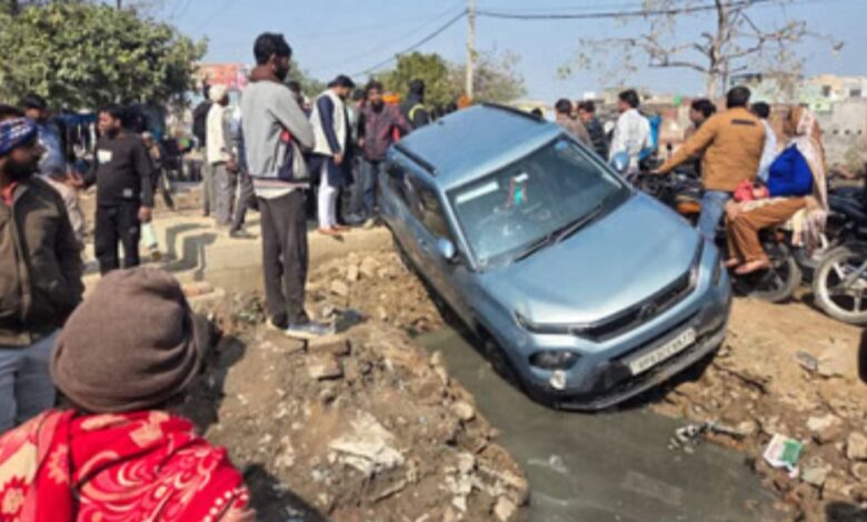 कोसीकलां में निर्माणाधीन नाले की पुलिया से नीचे लटकी कार