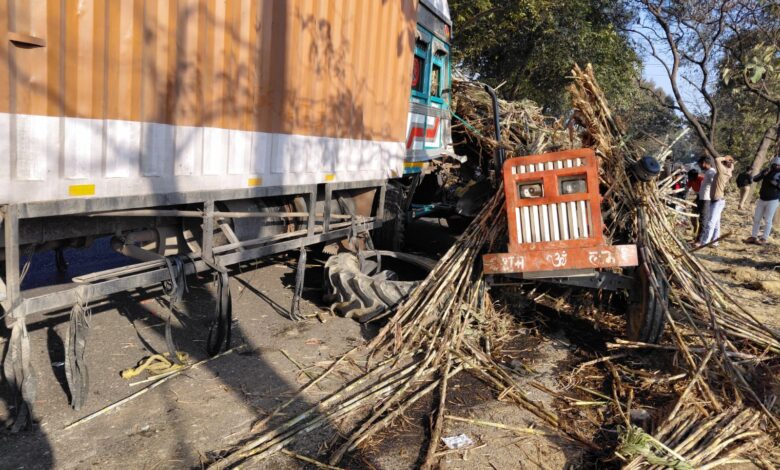 गन्ने से भरी ट्रैक्टर ट्राली और कंटेनर की आमने-सामने से भिड़त चालक घायल
