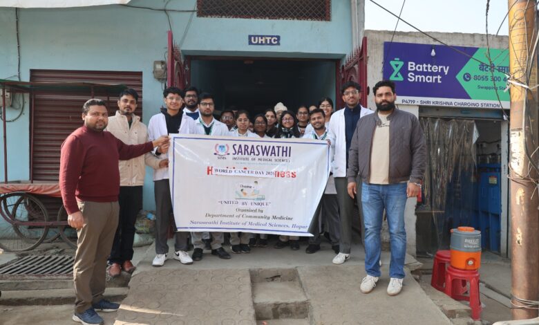 हापुड़ – सरस्वती आयुर्विज्ञान संस्थान , हापुड़ के सामुदायिक चिकित्सा विभाग के अंतर्गत शहरी स्वास्थ्य प्रशिक्षण केंद्र क्षेत्र में विश्व कैंसर दिवस के अवसर पर एक व्यापक सामुदायिक स्वास्थ्य जागरूकता कार्यक्रम का आयोजन किया गया। यह कार्यक्रम वैश्विक विषय “विशिष्टता में एकता” पर केंद्रित रहा, जिसका उद्देश्य आम जनमानस को कैंसर की रोकथाम, प्रारंभिक पहचान तथा समय पर जांच एवं उपचार के महत्व के प्रति जागरूक करना था।