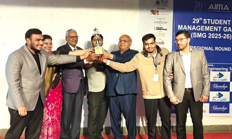 मेरठ। एमआईईटी बिजनेस स्कूल, मेरठ में ऑल इंडिया मैनेजमेंट एसोसिएशन (एआईएमए) के तत्वावधान में आयोजित 29वें स्टूडेंट मैनेजमेंट गेम्स का शनिवार को भव्य समापन एवं पुरस्कार वितरण समारोह आयोजित किया गया। तीन दिवसीय इस राष्ट्रीय स्तरीय प्रतियोगिता में विभिन्न प्रबंधन संस्थानों की 40 टीमों के 160 से अधिक विद्यार्थियों ने उत्साहपूर्वक सहभागिता की।