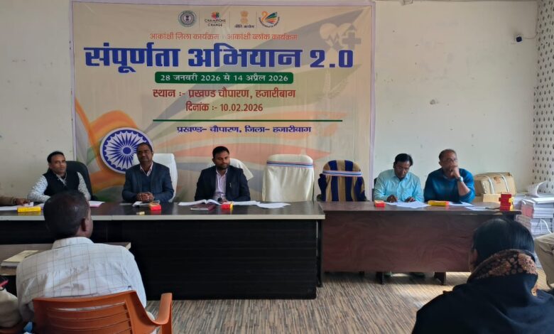 हज़ारीबाग़ चौपारण प्रखंड कार्यालय में मंगलवार को आकांक्षी प्रखंड कार्यक्रम के अंतर्गत संपूर्णता अभियान 2.0 का विधिवत शुभारंभ किया गया।कार्यक्रम में बताया गया कि संपूर्णता अभियान 2.0 के तहत आकांक्षी प्रखंड कार्यक्रम के अंतर्गत नीति आयोग निर्धारित 6 सूचकांक को 14 अप्रैल 2026 तक पूर्ण किया जाना है। इस अभियान का मुख्य उद्देश्य स्वास्थ्य, पोषण, स्वच्छता, शिक्षा, पशु टीकाकरण, कृषि जैसे महत्वपूर्ण क्षेत्रों को सुदृढ़ एवं प्रभावी बनाना है एवं ससमय लक्ष्य कि प्राप्ति करना हैं! अभियान के अंतर्गत आकांक्षी प्रखंड के निर्धारित संकेतकों जैसे 6 माह से 6 वर्ष के बच्चों को पूरक पोषण आहार, आंगनबाड़ी में सभी बच्चों कि माप दक्षता, आंगनबाड़ी में कार्यरत शौचालय एवं पेयजल कि उपलब्धता, विद्यालय में लड़कियों के लिए शौचालय की उपलब्धता, पशुओं को बोवाइन वैक्सीनेशन आदि की शत प्रतिशत संतृप्ति सुनिश्चित की जाएगी! यह अभियान 28 जनवरी 2026 से 14 अप्रैल 2026 तक मिशन मोड में चलाया जायेगा।